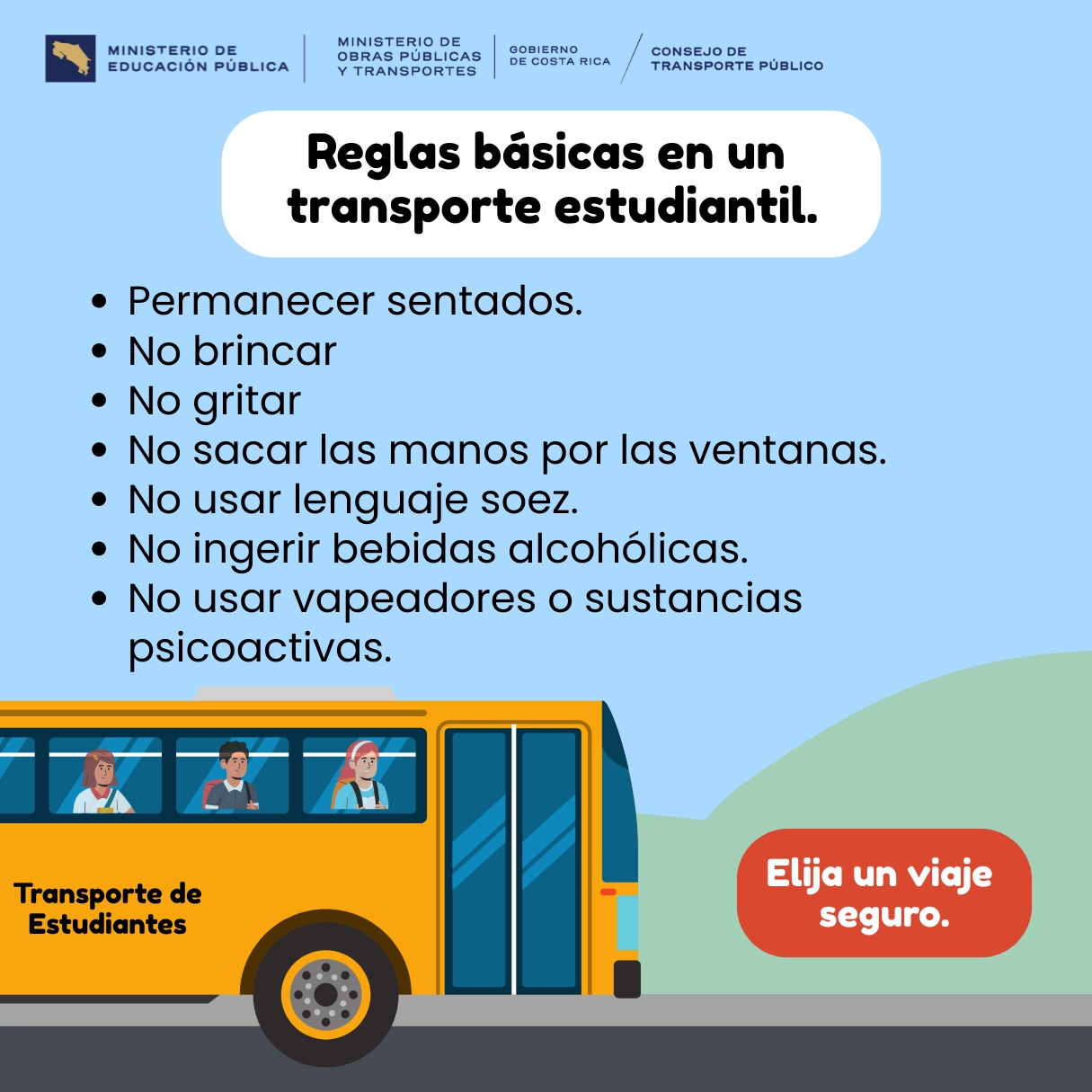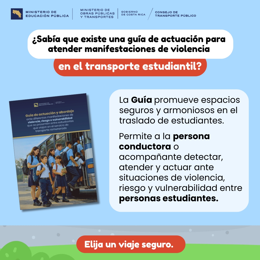 El Consejo de Transporte Público (CTP) del MOPT y el Ministerio de Educación Pública (MEP) publicaron la “Guía de actuación y abordaje ante diferentes manifestaciones de violencia, riesgo o vulnerabilidad que se presenten entre estudiantes que viajan en el servicio de transporte remunerado”.