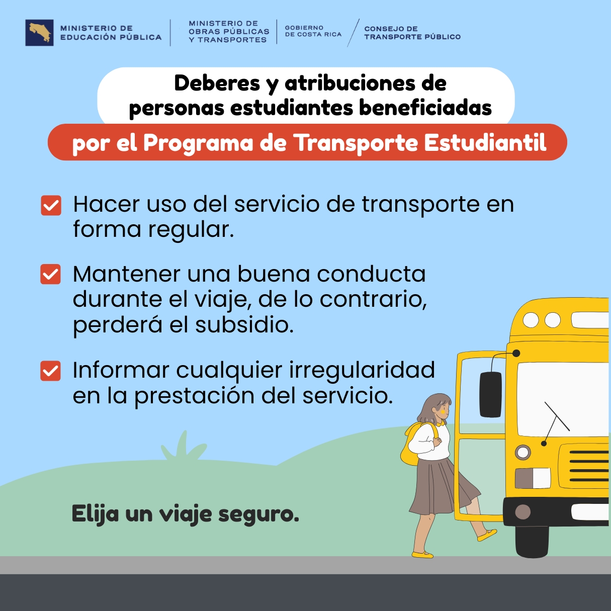 El incumplimiento de los deberes de conducta puede facultar la suspensión del beneficio de transporte estudiantil y en al caso de los transportistas pueden perder su permiso de operación. Con este instrumento, el Gobierno de la República reafirma su compromiso con la seguridad integral de la población estudiantil.