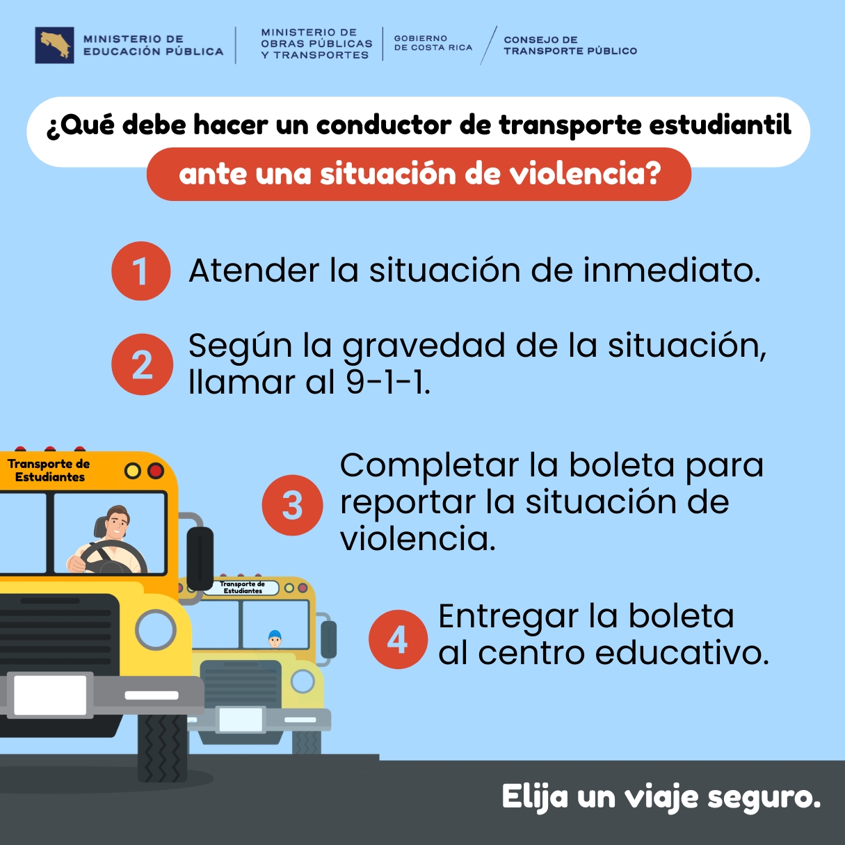 Ante manifestaciones de violencia, los encargados del transporte deben atender la situación de inmediato. En casos de riñas que pongan en riesgo la vida o situaciones de presunta violación, se debe coordinar de inmediato con el sistema de emergencias 9-1-1. Asimismo, deben completar una boleta de reporte con los detalles del incidente para remitirla de forma confidencial a la dirección del centro educativo.
